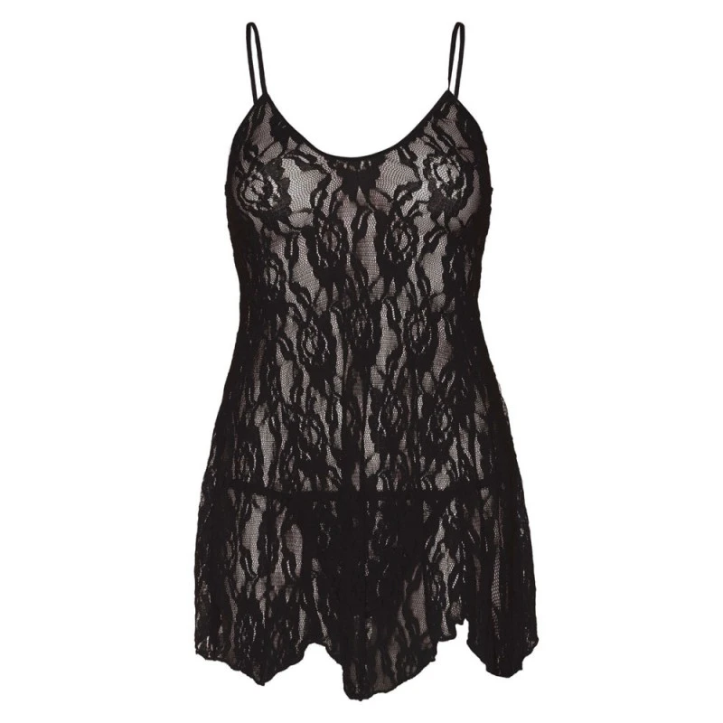 Cette robe grande taille mettra vos courbes en valeur et embellira votre corps grâce à sa dentelle florale noire. Vos hanches et vos cuisses seront soulignées par une coupe originale et ronde en dégradé. Portez le string assorti inclus pour un effet ravageur !