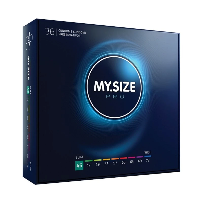 Découvrez la Boîte de 36 Préservatifs MY.SIZE Pro 45 mm, des préservatifs adaptés à votre taille vous permettant de profiter de rapports sécuritaires et confortables ! Peu importe votre taille, vous trouverez forcément des préservatifs qui vous conviendront avec MY.SIZE !