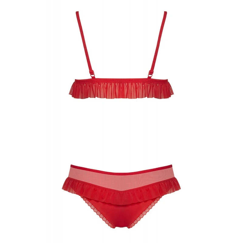 Il est composé d’une nuisette ouverte qui se transforme en soutien-gorge en quelques secondes, d’une culotte assortie et d’une capuche à rebord en plumes blanches, agrémentée d’un petit bijou en forme de flocon de neige.