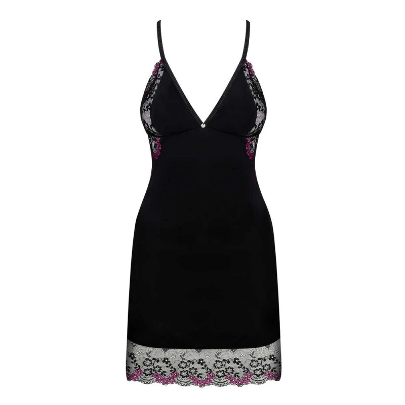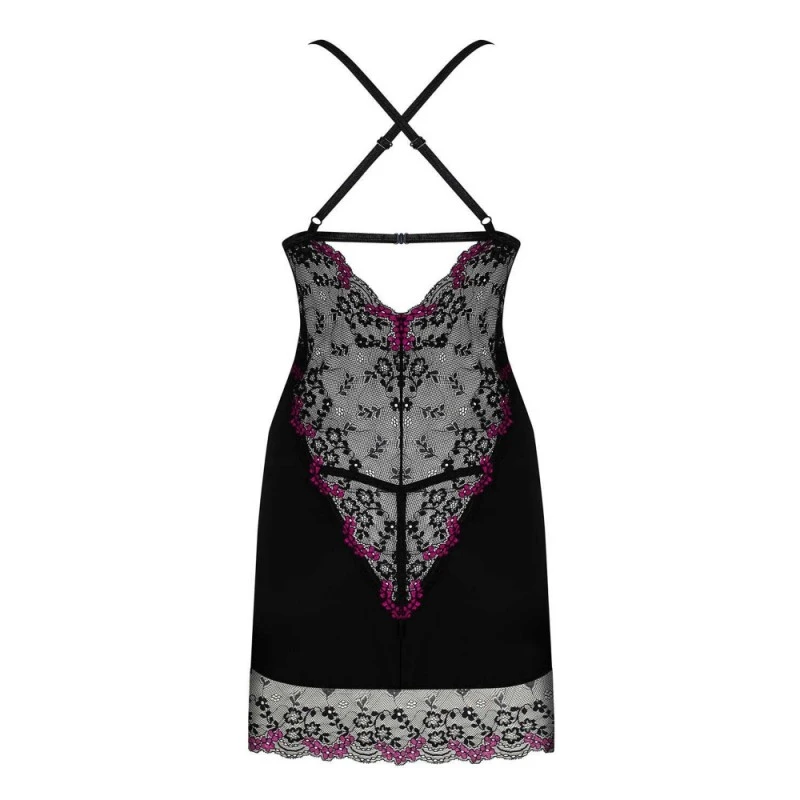 Découvrez la Nuisette Vanessme Dentelle Florale Noire Grande Taille de la marque Obsessive ! Cette nuisette opaque en maille noire dévoile un sublime décolleté dans le dos en dentelle florale noire et rose !